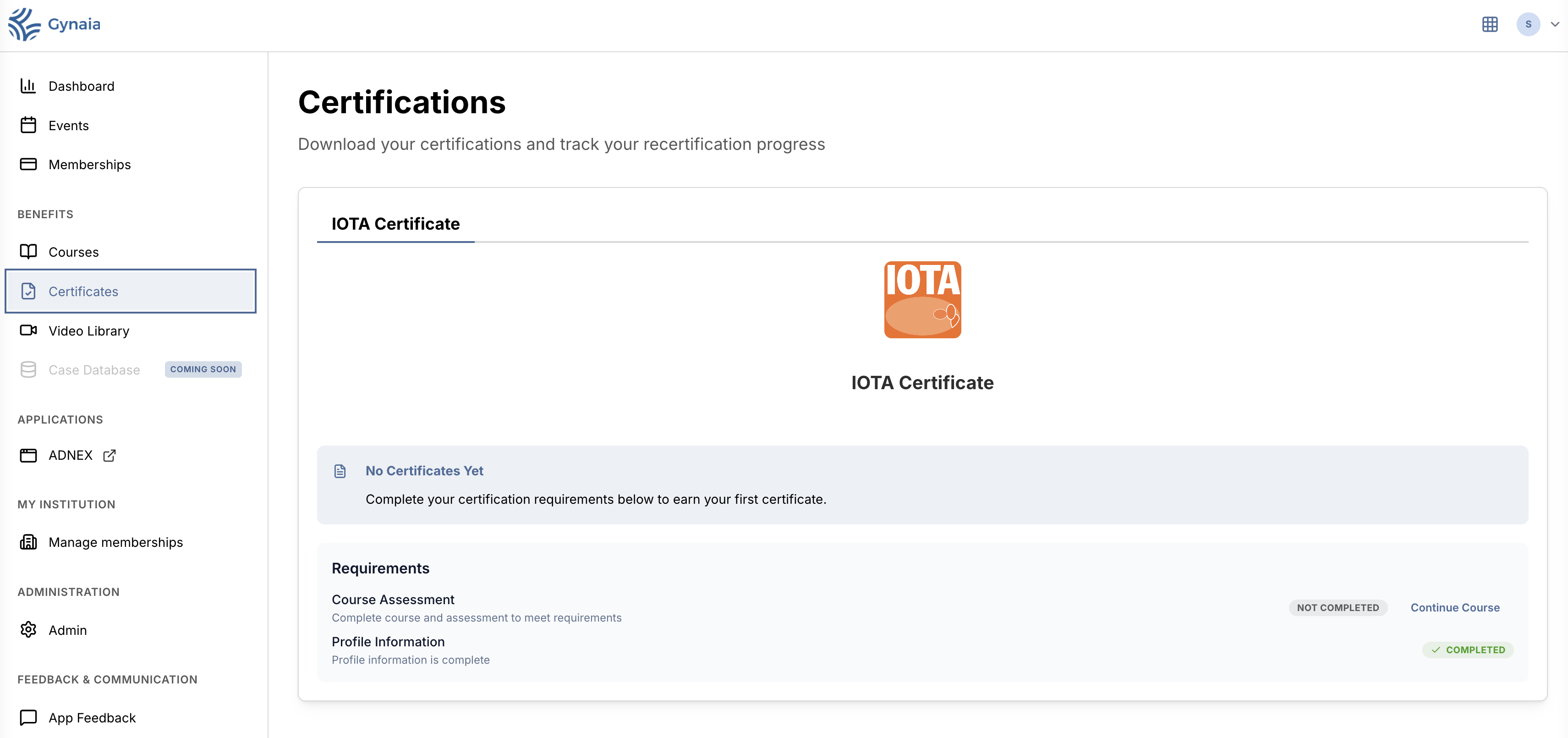 While requirements are incomplete, the page will show “No Certificates Yet”.
